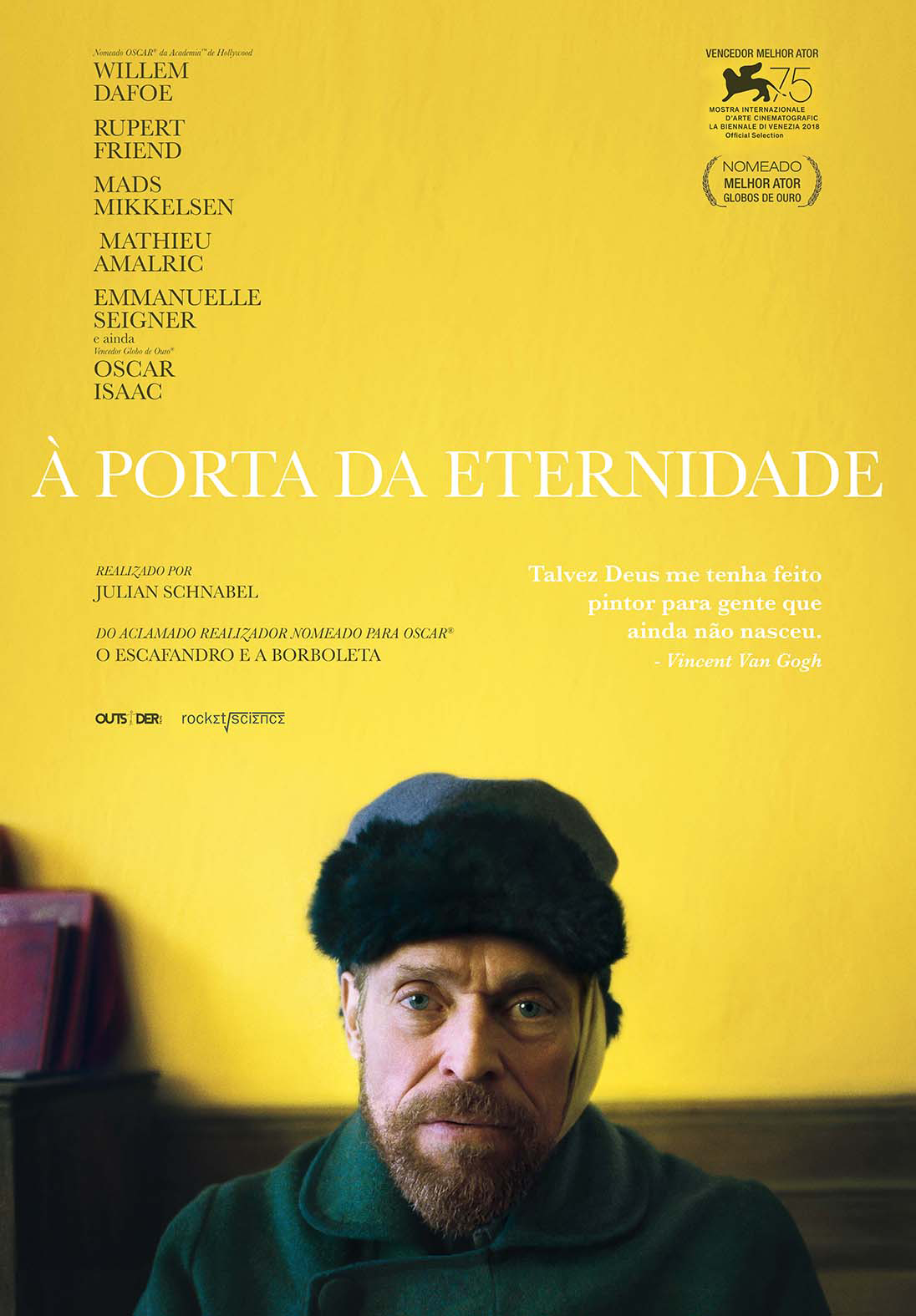 Nem sempre é fácil traçar a linha que separa a genialidade da loucura. Porque não se sabe onde começa uma e acaba. E mais complicado se torna quando é uma a alimentar a outra, num exercício incestuoso de criatividade. Van Gogh é disso o exemplo perfeito. <br />“À Porta da Eternidade” retrata os últimos anos da vida do pintor Vincent Van Gogh, da sua busca pela “luz que ninguém ainda viu”, a sua vontade não de vender quadros mas de “fazer com que as pessoas se sintam vivas”. O pintor descurava a alimentação, o vestuário e até as suas condições de vida, sempre em busca dessa perfeição inalcançável para todos – menos para ele. As suas explosões criativas traduziam-se numa pintura por impulso, “de uma pincelada só”, para que a emoção fluísse de si e da paleta de cores, fundindo-se na tela.<br /><br />Sobrevivia à custa do irmão Theo e apesar de conviver com pintores como Gauguin ou Cézanne, a verdade é que nunca se deixou influenciar, fiel ao seu espírito e à sua consciência. O passado católico era um das suas tormentas, porque Van Gogh achava que estava a servir a Deus, a ser um executante da Sua obra, pois foi “Deus quem me deu este dom”. O seu mundo, era só isso, um mundo só seu, que naturalmente chocava com o convencionado e normalizado em que vivemos. A loucura está do lado de quem não cede a sua liberdade criativa ou do lado de quem alinha obedientemente no rebanho social? <br /><br />Não é fácil filmar ou interpretar uma personagem atormentada e perturbada como o autor de “A Noite Estrelada” e de “Os Girassóis”. Julian Schnabel, que já assinara o biopic de outro artista, o norte-americano Jean-Michel Basquiat, recorre brilhantemente a vários expedientes para levar o espectador a entrar na mente do pintor. Desde logo, o mais óbvio, o recurso ao plano subjectivo, nomeadamente quando Van Gogh está mais perturbado. Depois, usando o mesmo recurso, coloca personagens a falarem directamente para os olhos de Van Gogh… que são os nossos. Depois, usa uma paleta de tons que mimetiza os do mestre holandês em muitas das suas obras. <br /><br />Tudo isto ajuda a homogeneizar a obra mas nada funcionaria se o actor que interpretasse Van Gogh não estivesse, ele próprio, muito próximo da perfeição. Felizmente, Willem Dafoe encarnou com profunda mestria a personalidade conturbada do autor de “Quarto em Arles” e “Campo de Trigo com Corvos”, fazendo esquecer as composições sobre a mesma personagens feitas por Kirk Douglas em “A Vida Apaixonada de Van Gogh” de Vincent Minelli e de Tim Roth em “Vincent & Theo” de Robert Altman, apenas se comparando à de Jacques Dutronc em "Van Gogh” de Maurice Pialat. Veneza reconheceu-o merecidamente como “Melhor Actor” o que deveria repetir-se nos Óscares, mas para que tal acontecesse era precisa uma certa dose de “loucura”… <br /><br />Normalmente, os biopics procuram centrar-se na reprodução mais fiel possível da vida do retratado. “Às portas da Eternidade” vai mais longe, ao provocar o espectador a questionar sobre os limites da sua própria vivência, do verdadeiro sentido de estar vivo, do alcance da palavra liberdade. E é isso que faz dele um grande filme.