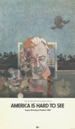 "America Is Hard to See" é um dos filmes menos vistos de Emile de Antonio e, como todos os seus filmes políticos, é constituído por material de arquivo (neste caso, com algumas intervenções do realizador) e aborda a tentativa do senador Eugene McCarthy, então célebre figura da ala esquerda do Partido Democrata, de ser o candidato do seu partido contra o presidente Lyndon Johnson, nas eleições presidenciais de 1968. A amarga conclusão do realizador é que o país “perdeu a sua generosidade”. Texto: Cinemateca Portuguesa
