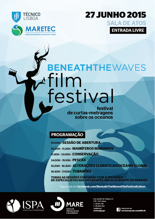 O ISPA e o grupo Maretec do Instituto Superior Técnico vai mostrar uma selecção de curtas-metragens relacionadas com oceanos, feitas por realizadores de todo o mundo. O Festival facilita a comunicação da ciência em larga escala, ao juntar filmes sobre os oceanos vindos de todo o mundo para discussão aberta enquanto fornece oportunidades educativas em primeira mão para investigadores interessados no cinema. O principal objectivo é encorajar, inspirar e educar cientistas, defensores dos oceanos e o público em geral para a produção e promoção de documentários gratuitos e cativantes acerca de temas marinhos. Texto: Beneath the Waves Film Festival