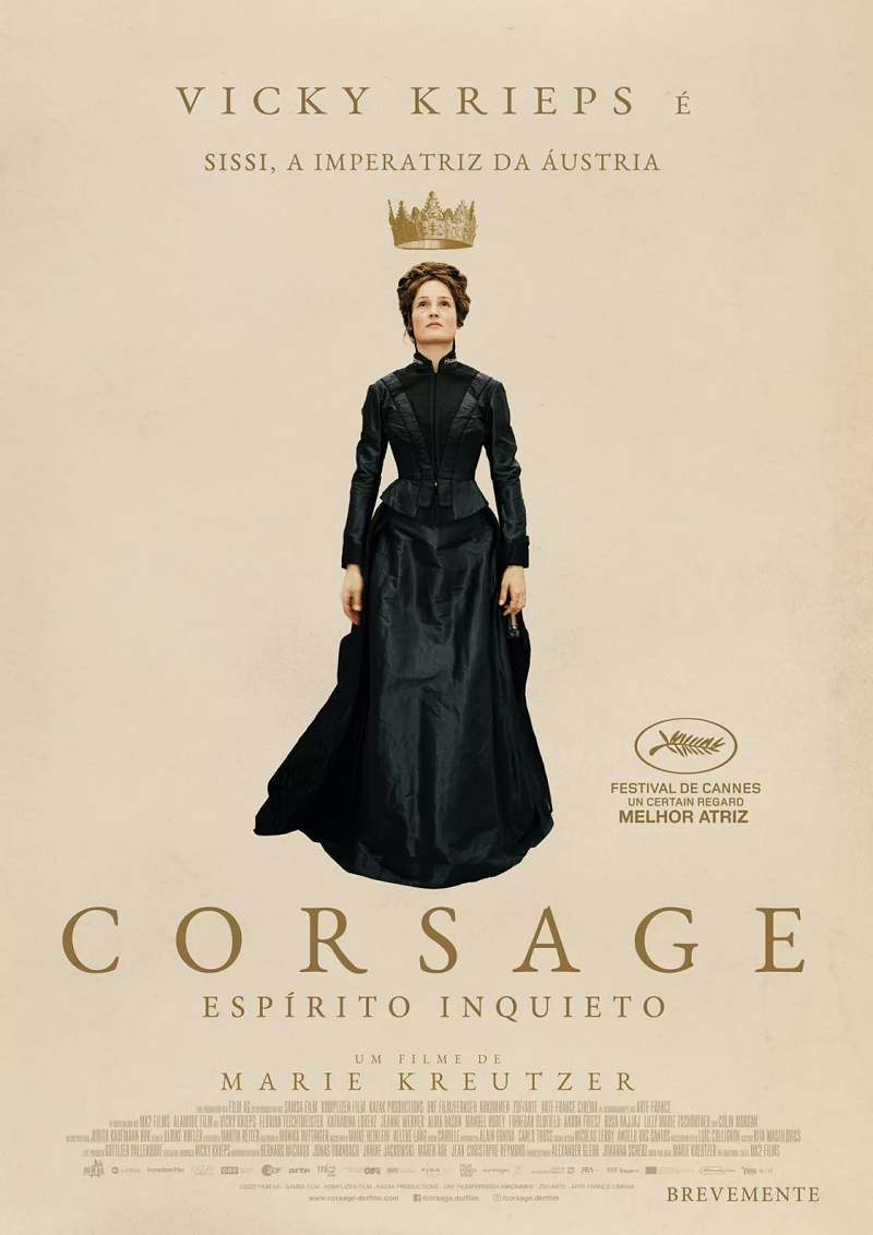 O filme "Corsage", da realizadora austriaca Marie Kreutzer, é um (anti) biopic de época (no qual realidade e ficção coexistem, sem que saibamos quais as fronteiras de cada uma delas), que recua até ao ano de 1878 para expor-nos perante as birras/"loucuras" (ou seriam rasgos de modernidade?) inerentes à "crise de meia-idade" (velhice na altura) da rebelde e indecifrável (tanto para o seu circulo próximo como para os súbditos) imperatriz da Áustria, Sissi. Para tornar a aura da obra ainda mais atípica (ou até surreal) para os cânones deste género cinematográfico (e diminuindo a sua credibilidade enquanto documento histórico), recorre a uma cenografia deliberadamente anacrónica (inserindo objectos actuais - por ex., esfreginas de plástico, candeeiros eléctricos ou sinais de emergência - no seio dos palácios algo decrépitos) associada a uma fotografia de tons saturadíssimos. Todavia, apesar destas idiossincrasias, que poderão ser criticáveis tanto positiva como negativamente (consoante a capacidade do espectador para digerir travestismos de eventos verídicos), um facto será inquestionável, a excelência da performance da luxemburguesa Vicky Krieps (que constrói uma personagem enigmática repleta de camadas).