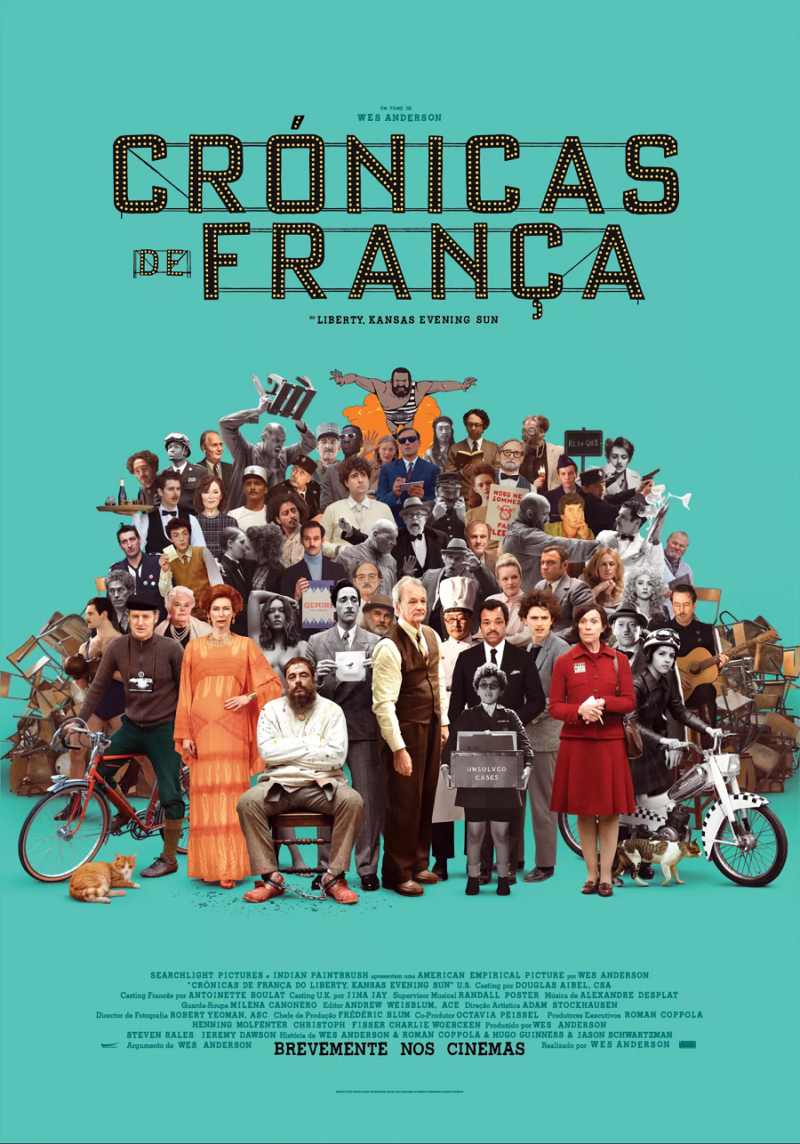 O décimo filme do Wes Anderson, "Crónicas de França do Liberty, Kansas Evening Sun", é uma carta de amor ao jornalismo, sob a forma de uma espécie de antologia de contos (três histórias jornalisticas fabuladas com segmentos narrativos distintos sem comunicação entre si) que nos transporta até ao seio de uma atipica (claro!) redação de um jornal de uma pequena cidade francesa imaginária de um tempo indefinido (e mais concretamente, até ao dia da sua última tiragem, decorrente do falecimento do seu fundador). <br /> <br />O enredo não é propriamente o mais interessante do mundo, para além de que se revela algo confuso (quiçá, fruto da sua estrutura episódica e da narração em off demasiado densa e acelerada). No entanto, tal é relegado para segundo plano devido ao modo como o mesmo é ilustrado: a transcendência da "marca Wes Anderson" (os habituais fantásticos universos estilizados; a deliciosa natureza simétrica e geométrica dos planos; os constantes travellings para "deslizar" entre os cenários desenhados ao mais infimo pormenor; a utilização de cores saturadas e pastel - desta vez com a inovação de intercalá-las com imagens a preto e branco; o recurso a "personagens robóticos"; e o seu inconfundível humor inexpressivo e sarcástico). <br />E depois há toda uma constelação de estrelas (poucas vezes vista) a abrilhantá-lo, nomeadamente, Bill Murray, Tilda Swinton, Jeffrey Wright, Frances McDormand, Timothée Chalamet, Léa Seydoux, Adrien Brody, Mathieu Amalric, Steve Park, Christoph Waltz, Liev Schreiber, Edward Norton, Saoirse Ronan, Willem Dalfoe e Anjelica Huston.