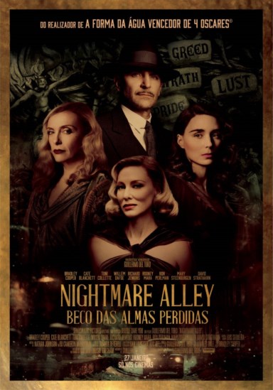 O realizador mexicano Guilermo Del Toro está de volta aos ecrãs de cinema com Nightmare Alley, mais uma fábula burlesca (desta feita também com uns pozinhos de filme noir) povoada por uma constelação de mega-estrelas de Hollywood (Cate Blanchett, Willen Dafoe, Bradley Cooper, Rooney Mara, Toni Collette e Ron Perlman).