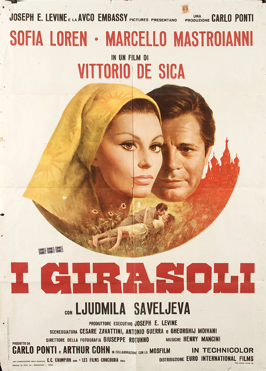 Foi com este I Girasoli que Vittorio De Sica realizou o primeiro filme ocidental rodado na URSS, uma história de amor entre as personagens de Marcello Mastroianni e Sophia Loren. Ela é uma mulher italiana que procura o marido dado como perdido em acção durante a II Guerra. A travessia faz-se por paisagens urbanas e campos de girassóis. Foi o filme mais famoso da dupla de actores. Texto: Cinemateca Portuguesa