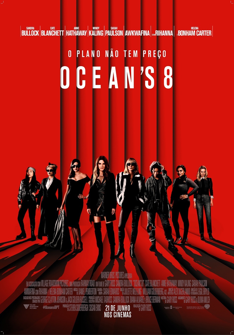 Mais um remake "Ocean's" (8), desta vez sem testosterona (e sob a direcção de Gary Ross - tendo o Soderbergh ficado apenas pela produção). Só estrogénio (e de qualidade - por ex., Sandra Bollock, Cate Blanchett, Anne Hathaway - divinal! -, Helena Bonham Carter, Katie Holmes), todavia, esta espécie "power women" (quiçá, inspirado no ridiculo #MeeToo) não excita por aí além (e não é que as moças não se esforcem, mas falta te(n)são à narrativa - e apesar desta até possuir alguns bons preliminares ... ups diálogos, não são suficientes para o clímax que seria expectável).